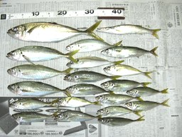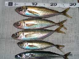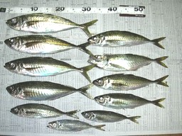 ついに春アジが大漁、それにカタクチイワシ。 今日こそはと意気込んで向かったものの 夕方はカタクチイワシの大群。 6時を過ぎたころから18cmから24cmの アジが次々と釣れはじめました。 久しぶりに火力がにぎわった1日でした。 早速、刺し身にして食べましたが、予想以上 に脂がのっていておいしいものでした。 |