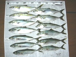 今日の白木も昼からの釣り。 釣りはじめはフグばかりでしたが、あちこち 探っているとキスも釣れだしました。 12〜18cmのキスが11匹とヒイラギが2匹。 突堤付近には小アジの群れ。 今度は甥っ子たちと来てみようと思います。 ヒイラギの表面はヌルヌルですが、焼いて 食べてみると淡白でおいしいものでした。 キスは煮こごり、明日が楽しみです。 |