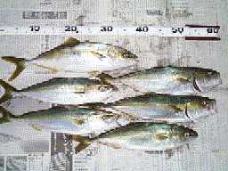 朝暗いうちから釣り始めたが、気配なし。 青塚にも移動してみたが、ポツポツ程度。 8時を過ぎ、北港のほうへ行ってみようかな と思っていると、白木の突堤あたりに鳥山! 早速、行ってみるとすごいナブラでした。 投げればアタルというほどで、何度かハズレ ましたが、35〜38cmのアオコが6匹。 引きは、ほとんどイナダ級でした。 まだ釣れそうでしたが、工事で9時に終了。 |