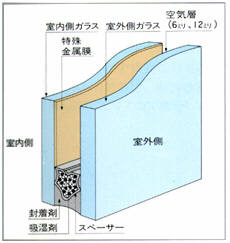 サンレーヌは、断熱性に優れた複層ガラスの室内側ガラスの中間空気層側に断熱・保温効果に優れた透明な特殊金属膜をコーティングした物です。複層ガラスの断熱効果と特殊金属膜の採光・保温機能とが融合しました。