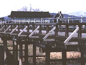 写真は荒瀬川にかかる新大橋。鳥海山が真近かに迫る風景の中を、春の祭の行列が今も通るふるさとの懐しい木造橋。 |