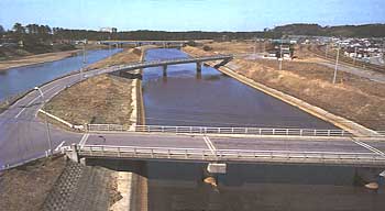 写真は手前から、月光川と洗沢川の合流地に架けられた吹浦橋、洗沢橋、吹浦新橋、奥にリゾート施設″遊楽里″があたまを見せている。 |