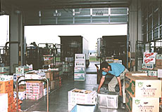 産地からいろいろな野菜や果物が入荷します。到着した品物は、卸売業者が受け取ります。野菜や果物は品目別・等級別に区分けされ、ダンボール箱に入ったまま卸売場に並べられます。 |