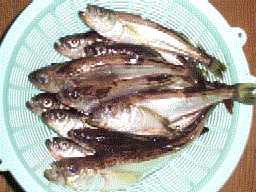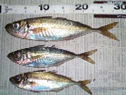 一昨日の夕方にセイゴ、フッコが5、6匹 釣れているのを見て同じように釣りをして みましたが、セイゴは現われませんでした。 それでも、15〜18cmのサバ、アジそれに カタクチイワシは忙しいほど釣れました。 小魚はあふれるほどいるのに、大物の姿を 見ることはありませんでした。 サバは味噌煮、アジは南蛮漬けにしていた だきましたが、この時期の魚は夏バテ対策 には欠かせないものだと思います。 |