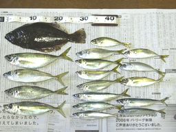 夕方から夜、アジ、根魚で大漁。 夕方5時頃からの釣り始めで、まずはアジ。 すでに釣れはじめている様子で、30cm超の サバやマイワシも混じり、中層で好調。 アジは右写真の他に20匹弱と大漁でした。 暗くなってからは場所を移動してメバル。 潮の流れがあまりなく不調かと思いましたが、 探っているとかなり手前の底あたりで好調。 30cmのクロソイやカサゴも釣れ大漁でした。 |